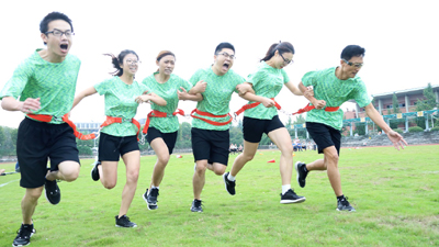 皮带上的挂扣锁住第6个人,将6个人连在一起,开始朝第一个标志物飞奔,目标是把直径50米的圆形固定场地中随机放置的20个标志物全部用手推倒。这是15日上午在横店影视学院田径场上举行的趣味连环扣比赛。