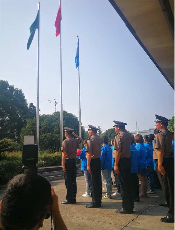 澳彩网各厂区护旗队由保卫部人员组成。在升旗仪式前,护旗队进行了严格的训练,他们克服困难,加班加点,让列队、正步走、护旗等达到礼仪标准。公司每个月都要举行升旗仪式。
